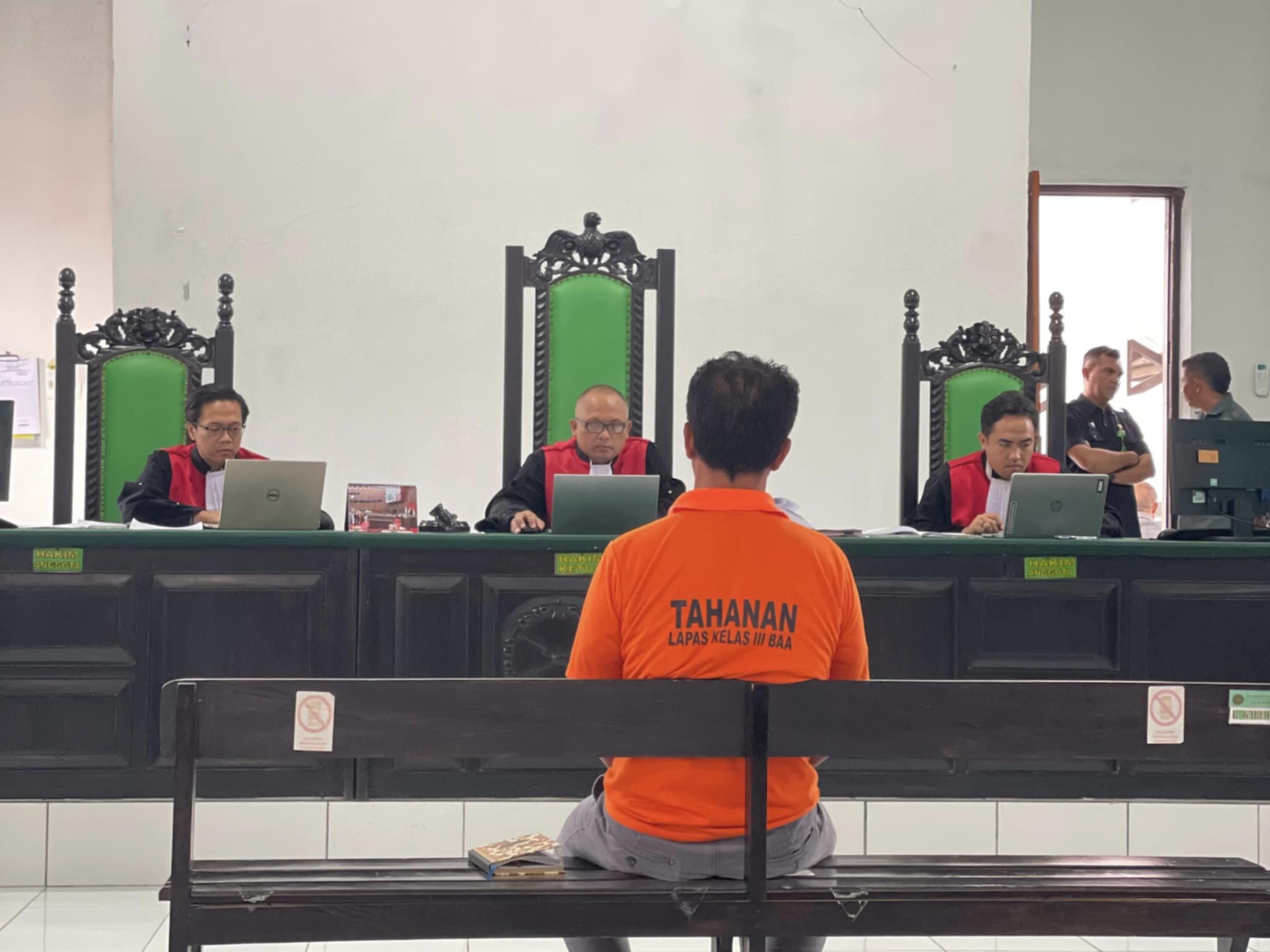 Di dalam ruang sidang, Erasmus masuk pada pukul 14.00 Wita dengan tangan terborgol namun tetap senyum dan melambai menyemangati pengunjung. Yang Mulia Majelis Hakim I Gede Susila Guna Yasa, S.H., M.H.—Wakil Ketua Pengadilan Negeri Rote Ndao Kelas II—memasuki ruangan pada pukul 14.12 Wita dan menanyakan kesiapan Erasmus.