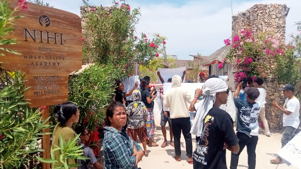 BO’A | Nemberalanews.com – Ratusan warga masyarakat Desa Bo’a, Kecamatan Rote Barat, Kabupaten Rote Ndao, Nusa Tenggara Timur, Kamis (9/10/2025) pagi pukul 10.30 wita melakukan aksi di depan salah satu pintu masuk kawasan resort Nihi Rote yang dikelola PT Bo’a Development.