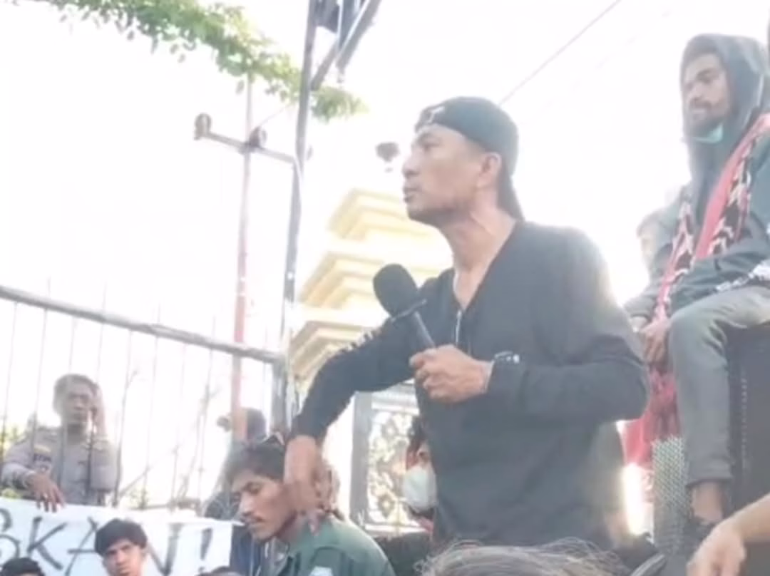 Rudolf Frans Mandato, di atas kendaraan menyampaikan orasinya di depan Mapolres Rote Ndao, (Foto: Nemberalanews.com).