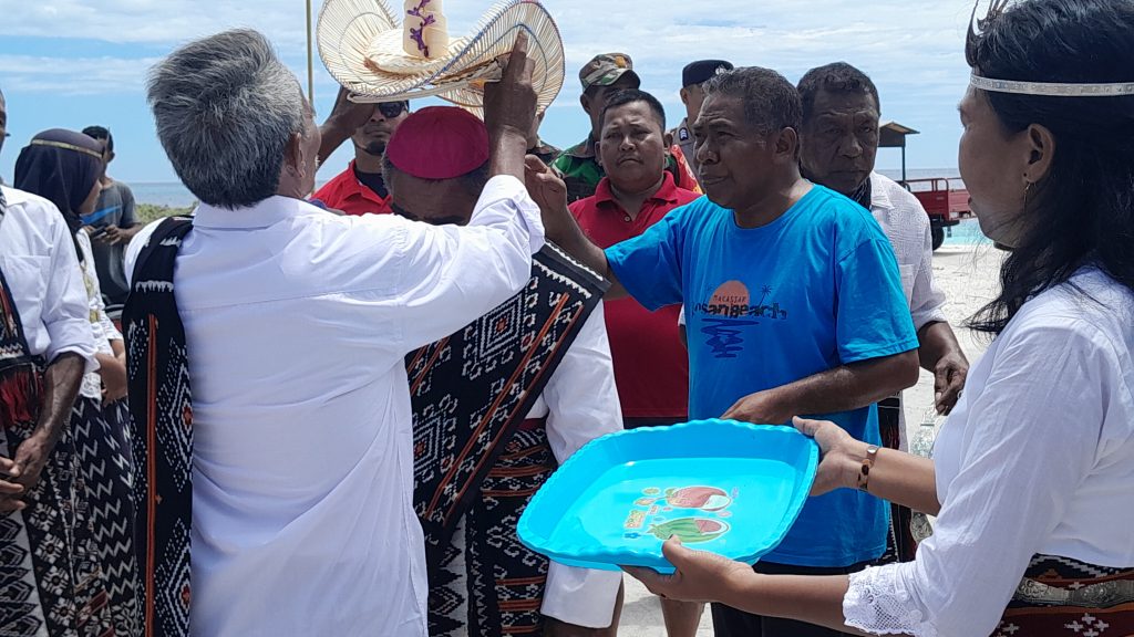 Ketua Stasi Santo Petrus Ndao Anton Penu memasang topi Ti'i Langga di kepala Yang Mulia Uskup Agung Mgr. Hironimus Pakaenoni di Pantai (Foto: Sergius S. Tobuawen).